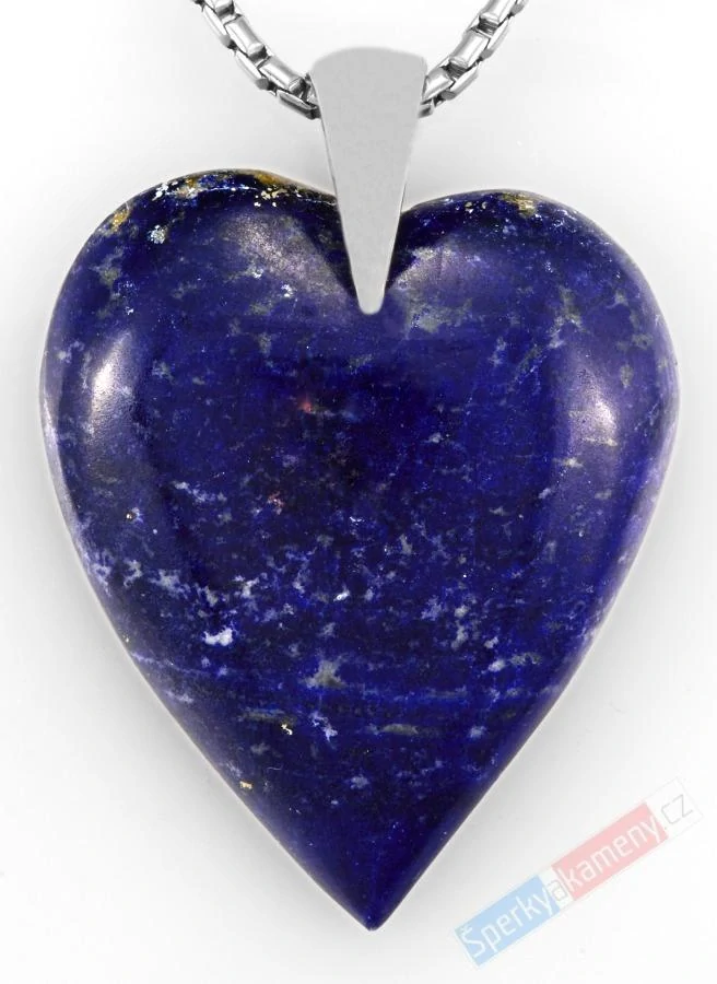 Přívěsek z lapisu lazuli vysoké kvality QA a nádherné barvy. Přívěsek má tvar srdce o výšce cca 34 mm (s úchytem cca 39 mm) a šířce cca 29 mm; váha 9,7 g. Úchyt je ze stříbra (Ag 925/1000). Původ minerálu: Afghánistán. Řetízek není součástí šperku. Přívěsek je identický s fotografií.