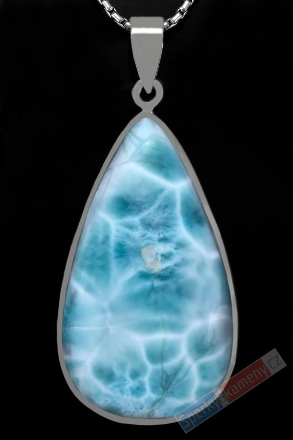 Přívěsek z larimaru vysoké kvality QA (RARITA)s krásnou kresbou. Přívěsek má tvar větší kapky o výšce cca 48 mm (s úchytem cca 61 mm), šířce cca 28 mm a váze 22,4 g. Úchyt, závěs a zasazení jsou ze stříbra (Ag 925/1000). Původ minerálu: Dominikánská republika, jediné naleziště na světě. Řetízek není součástí šperku. Přívěsek je identický s fotografií.