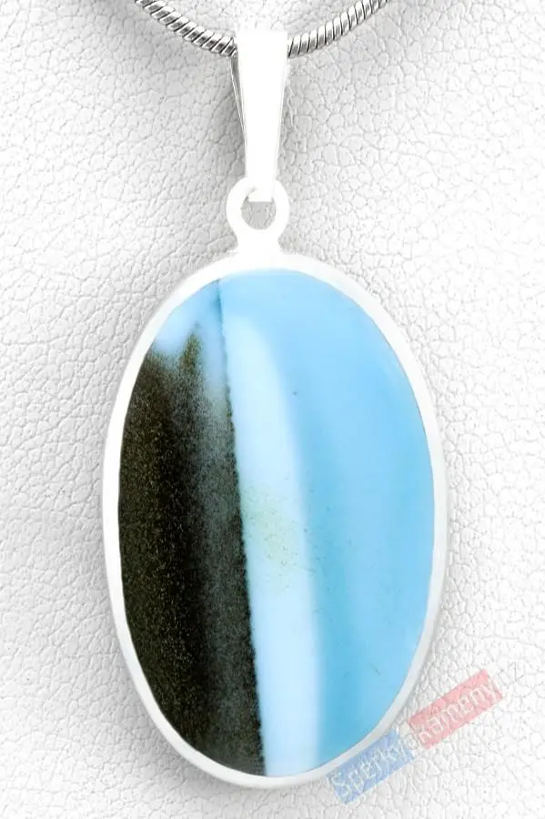 Přívěsek z modrého opálu extra kvality QAA. Nádherná modrá barva s nenapodobitelnou kresbou minerálu (RARITA). Přívěsek má tvar většího oválu o výšce cca 29 mm (s úchytem cca 34 mm) a šířce cca 46 mm; váha 14,6 g. Zasazení a originální úchyt jsou ze stříbra (Ag 925/1000). Původ minerálu: Austrálie. Řetízek není součástí přívěsku.