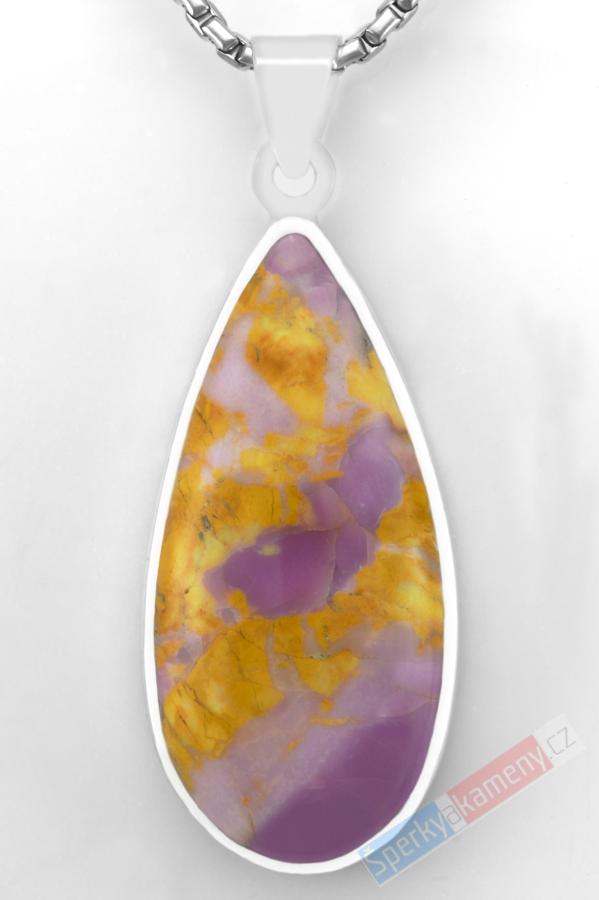 Přívěsek z phosphosideritu vysoké kvality QA (RARITA) krásného probarvení minerálu, kde fialovou barvu prolíná žlutá. Přívěsek má tvar kapky o výšce cca 35 mm (s úchytem cca 44 mm) a šířce cca 17 mm; váha 6,9 g. Úchyt, zasazení a závěs jsou ze stříbra (Ag 925/1000). Řetízek není součástí šperku. Původ minerálu: Brazílie. Přívěsek je identický s fotografií.