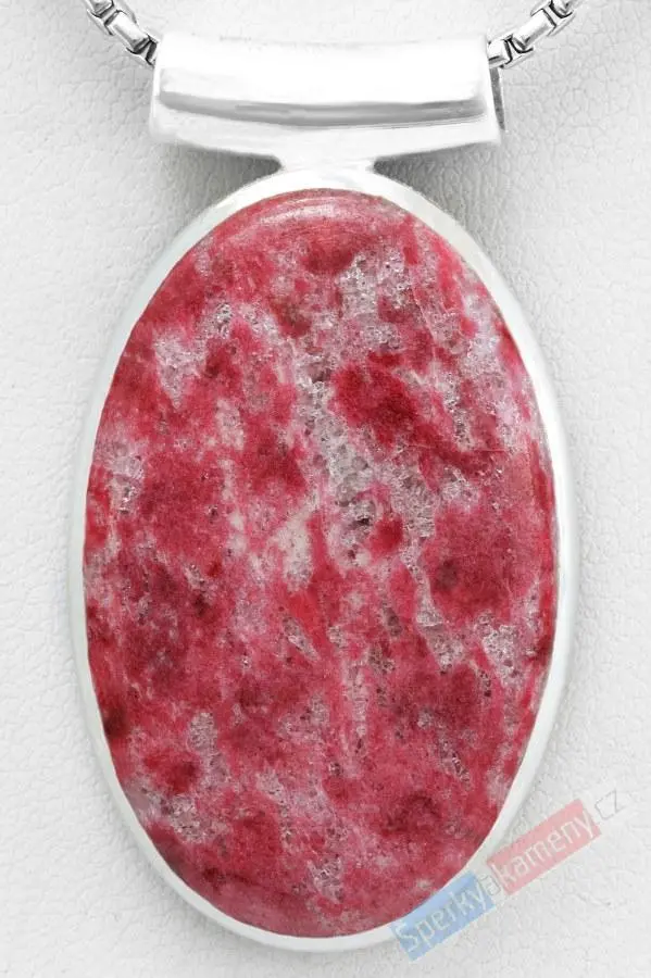 Přívěsek z thulitu extra kvality QAA (RARITA) nádherné výrazné sytě malinové barvy. Přívěsek má tvar oválu o výšce cca 38 mm (s úchytem cca 44 mm), šířce cca 25 mm a váze 13,4 g. Zasazení a originální úchyt jsou ze stříbra (Ag 925/1000). Původ minerálu: Norsko. Řetízek není součástí šperku. Přívěsek je identický s fotografií.