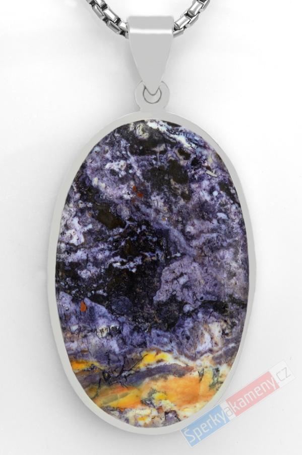 Stříbrný přívěsek (Ag 925/1000) s Tiffany Stone vysoké kvality QA (RARITA) nádherného probarvení minerálu. Přívěsek má tvar oválu o výšce cca 40 mm (s úchytem cca 51 mm) a šířce cca 25 mm; váha 12,5 g. Řetízek není součástí šperku. Původ minerálu: Utah, USA jediné naleziště na světě. Přívěsek je identický s fotografií.