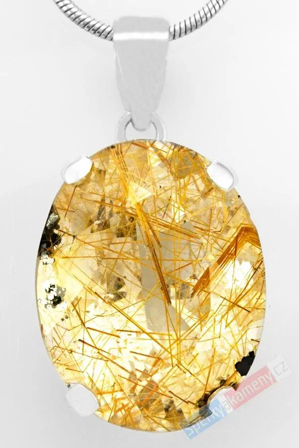 Přívěsek z broušeného sagenitu (křišťál prorostlý rutilem) vysoké kvality QA s nádherně zlatými vlákny rutilu v křišťálu. Přívěsek má tvar oválu o výšce cca 22 mm (s úchytem cca 31 mm), šířce cca 17 mm a tloušťce cca 12 mm; váha 8,9 g. Zasazení, úchyt a závěs jsou ze stříbra (Ag 925/1000). Původ minerálu: Brazílie. Řetízek není součástí šperku. Přívěsek je identický s fotografií.