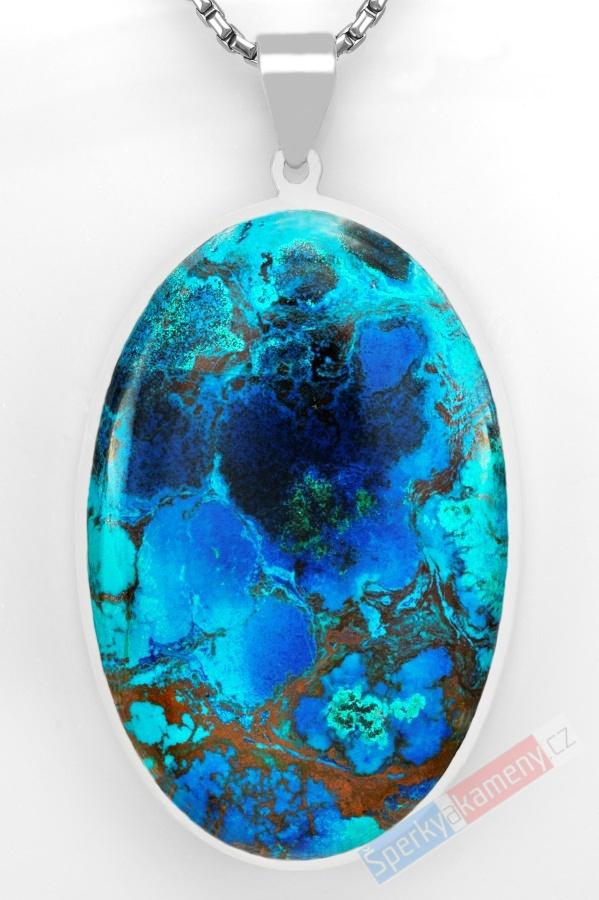 Velký přívěsek ze šatukitu (shattuckit) vysoké kvality QA (RARITA) s nádherným probarvením, které je naprosto originální a nikdy se neopakuje. Přívěsek má tvar oválu o výšce cca 50 mm (s úchytem cca 62 mm) a šířce cca 34 mm; váha 23,7 g. Zasazení, úchyt a závěs jsou ze stříbra (Ag 925/1000). Původ minerálu: Namíbie. Přívěsek je identický s fotografií.