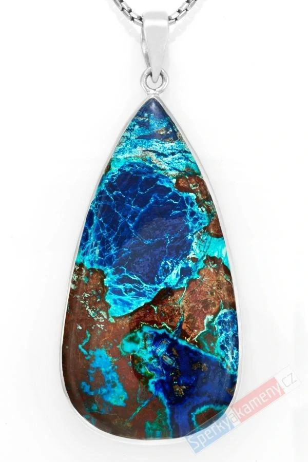 Velký přívěsek ze šatukitu (shattuckit) vysoké kvality QA (RARITA) s nádherným probarvením, které je naprosto originální a nikdy se neopakuje. Přívěsek má tvar kapky o výšce cca 57 mm (se závěsem cca 69 mm) a šířce cca 30 mm; váha 23,2 g. Zasazení, úchyt a závěs jsou ze stříbra (Ag 925/1000). Původ minerálu: Namibie. Přívěsek je identický s fotografií.