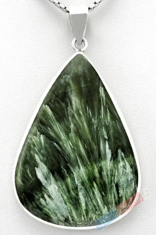 Přívěsek z nádherně zbarveného serafinitu extra kvality QAA (RARITA) sneopakovatelnou kresbou minerálu. Serafinit je též nazýván „kámen andělů“. Přívěsek má tvar velké kapky o výšce cca 53 mm (s úchytem cca 65 mm) a šířce cca 38 mm; váha 17,6 g. Úchyt, závěs a zasazení jsou ze stříbra (Ag 925/1000). Původ minerálu: Sibiř (Rusko).