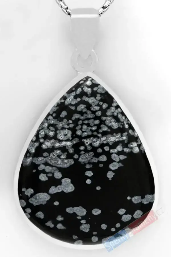 Přívěsek ze sněžného neboli vločkového obsidiánu vysoké kvality QA. Přívěsek má tvar větší kapky o výšce cca 41 mm (s úchytem cca 53 mm), šířce cca 34 mm a váze 15,8 g. Úchyt, závěs a zasazení jsou ze stříbra (Ag 925/1000). Původ minerálu: Etiopie. Řetízek není součástí šperku. Přívěsek je identický s fotografií.