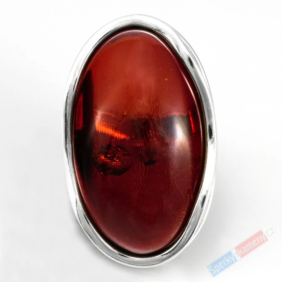 Stříbrný prsten (Ag 925/1000) s baltským jantarem extra kvality QAA nádherné koňakové barvy. Tento typ nádherných jantarů se nachází pouze na Baltu. Prsten má tvar velkého oválu o výšce cca 44 mm a šířce cca 28 mm (z toho stříbrné zasazení cca 1,5 mm); váha prstenu 17,6 g. Nastavitelná velikost od cca 56 do cca 59. Původ minerálu: oblast Baltu, Polsko. Prsten je identický s fotografií.