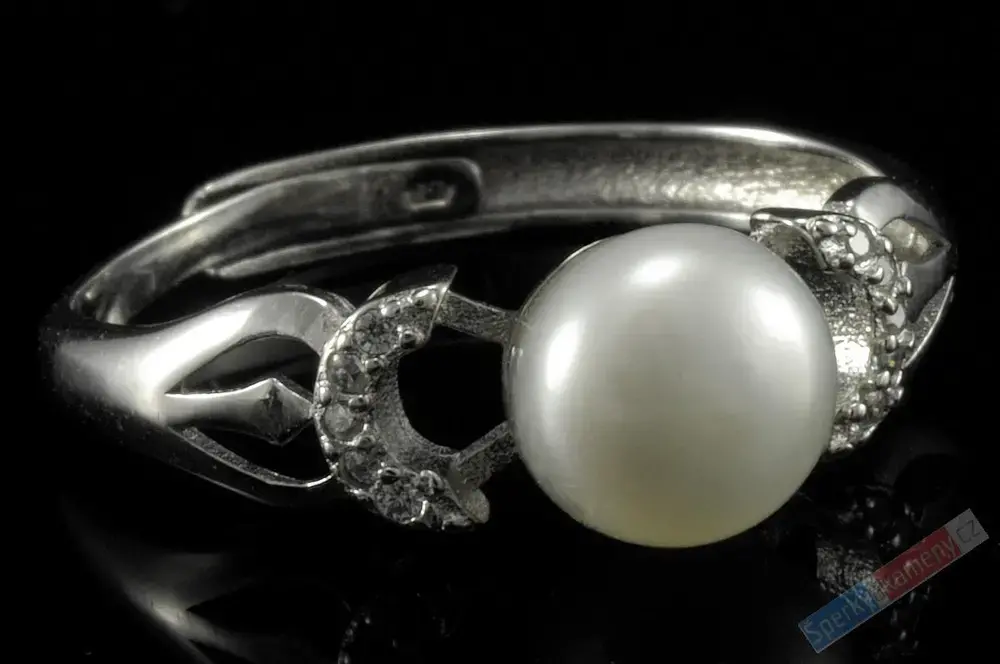 Stříbrný prsten (Ag 925/1000) s bílou kulatou říční perlou a zirkony. Perla o velikosti cca 7 mm. Nastavitelná velikost od cca 56 až 59. Prsten je identický s fotografií.