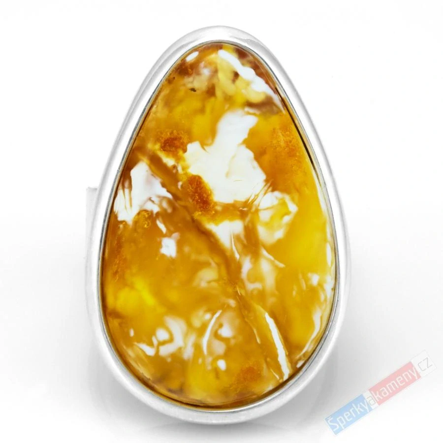 Stříbrný prsten (Ag 925/1000) s baltským bílým jantarem prorostlým ve žlutém jantaru extra kvality QAA. Nádherná kombinace výrazných zářivých barev připomínající slunce zakryté bílým mráčkem. Tento druh nádherných jantarů se nachází pouze na Baltu. Prsten má tvar velké kapky o výšce cca 34 mm a šířce cca 23 mm Váha prstenu 16,7 g. Zadní strana prstenu je většinově ze stíbra. Velikost prstenu je 59/60 (lze ji mírně upravit na šperkařském trnu). Původ minerálu: oblast Baltu, Polsko. Prsten je identický s fotografií.