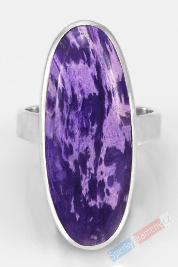 Velký stříbrný prsten (Ag 925/1000) s čaroitem extra kvality QAA. Kámen o výšce cca 32 mm a šířce cca 14 mm. Váha prstenu 8,6 g. Nastavitelná velikost od cca 54 do cca 58. Původ minerálu: Rusko, Jakutsko. Prsten je identický s fotografií.