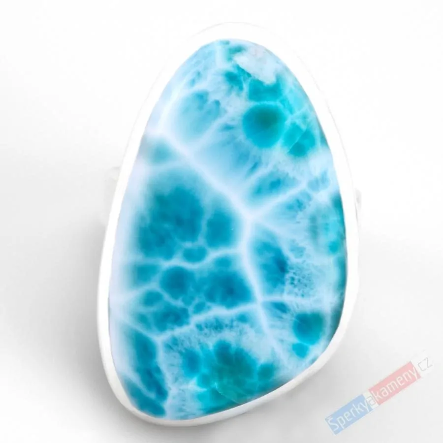 Velký stříbrný prsten (Ag 925/1000) s larimarem extra kvality QAA (RARITA). Nádherná kresba. Kámen má originální tvar o výšce cca 32 mm a šířce cca 21 mm; váha prstenu 12,8 g. Nastavitelná velikost od cca 54 do cca 59. Původ minerálu: Dominikánská republika, jediné naleziště na světě. Prsten je identický s fotografií.