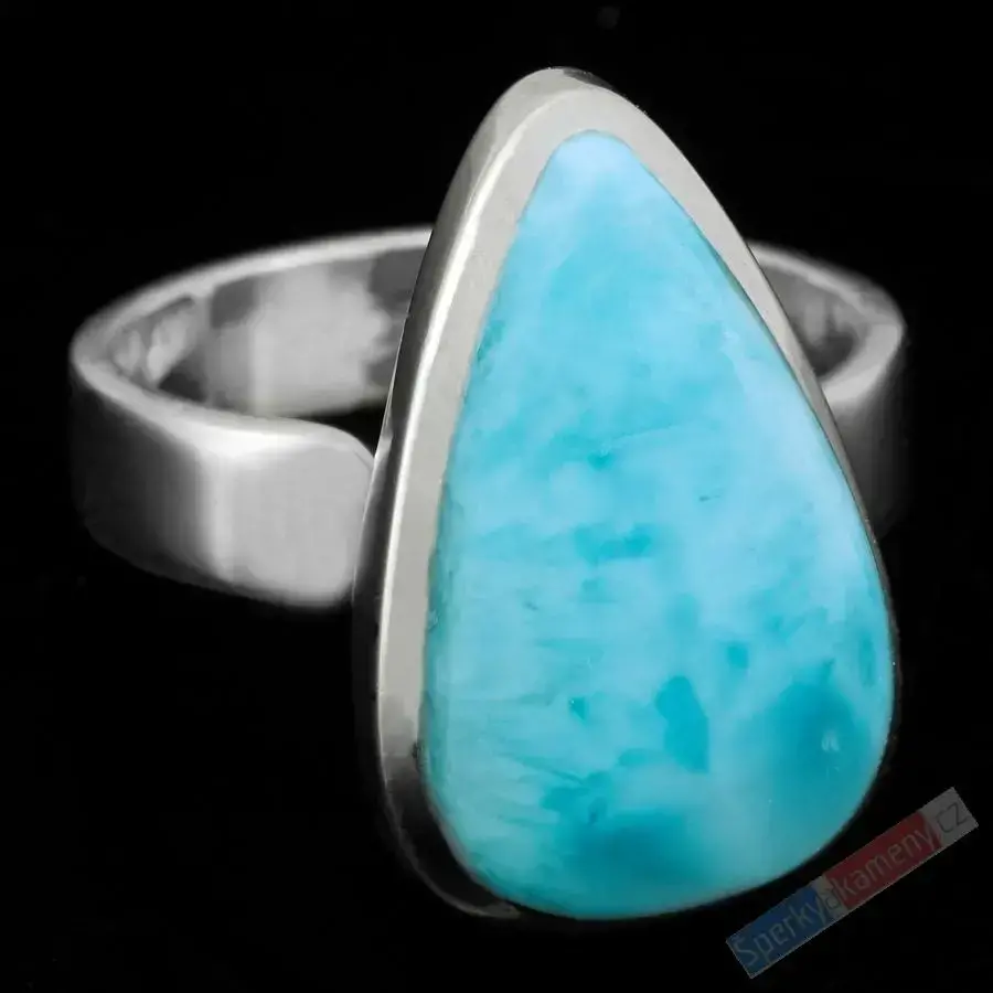 Stříbrný prsten (Ag 925/1000) s larimarem vysoké kvality QA (RARITA). Kámen o výšce cca 20 mm a šířce cca 13 mm; váha prstenu 5,7 g. Nastavitelná velikost od cca 51 do cca 56. Původ minerálu: Dominikánská republika, jediné naleziště na světě. Prsten je identický s fotografií.