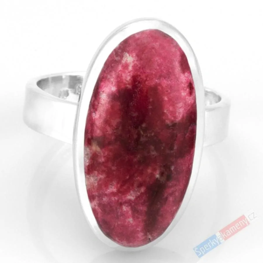 Stříbrný prsten (Ag 925/1000) s thulitem extra kvality QAA (RARITA). Kámen má tvar štíhlého oválu o výšce cca 25 mm a šířce cca 14 mm; váha prstenu 8,0 g. Nastavitelná velikost od cca 57 do cca 63. Původ minerálu: Norsko. Prsten je identický s fotografií.