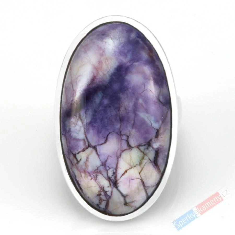 Velký stříbrný prsten (Ag 925/1000) s Tiffany Stone vysoké kvality QA (RARITA). Kámen o výšce cca 33 mm a šířce cca 20 mm; váha prstenu 11,4 g. Prsten není nastavitelný, k dispozici je pouze velikost 56/57. Původ minerálu: Utah, USA jediné naleziště na světě. Prsten je identický s fotografií.