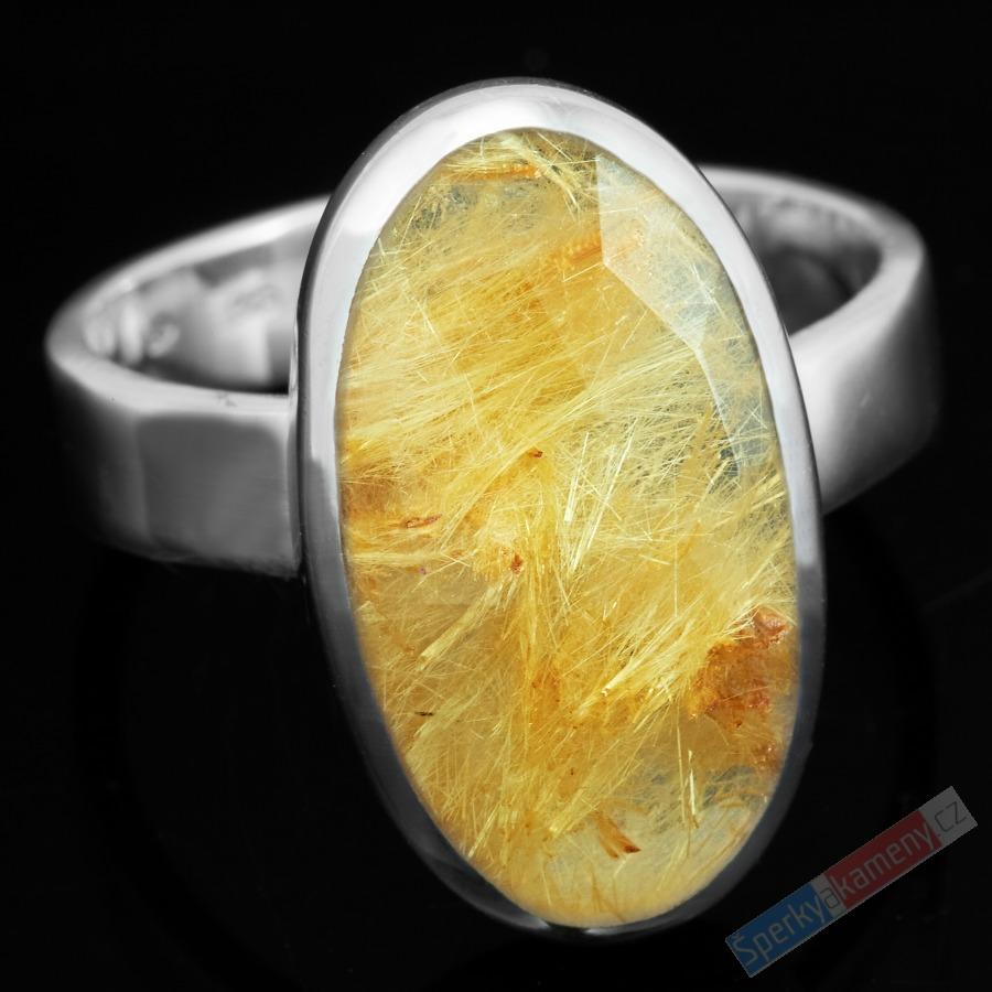 Stříbrný prsten (Ag 925/1000) s broušeným/fasetovaným sagenitem extra kvality QAA (RARITA). Kámen o výšce cca 21 mm a šířce cca 12 mm; váha prstenu 6,1 g. Nastavitelná velikost od cca 51 do cca 60. Původ minerálu: Brazílie. Prsten je identický s fotografií.