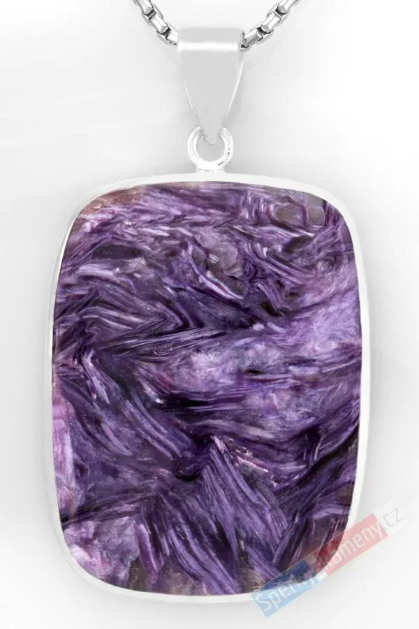 Unisex přívěsek z čaroitu extra kvality QAA. Nádherné probarvení a vysoký lesk. Přívěsek má tvar většího obdélníku o výšce cca 41 mm (s úchytem cca 54 mm) a šířce cca 31 mm; váha 15,9 g. Zasazení, úchyt a závěs jsou ze stříbra (Ag 925/1000). Země původu: Rusko, Jakutsko. Řežízek není součástí šperku. Přívěsek je identický s fotografií.