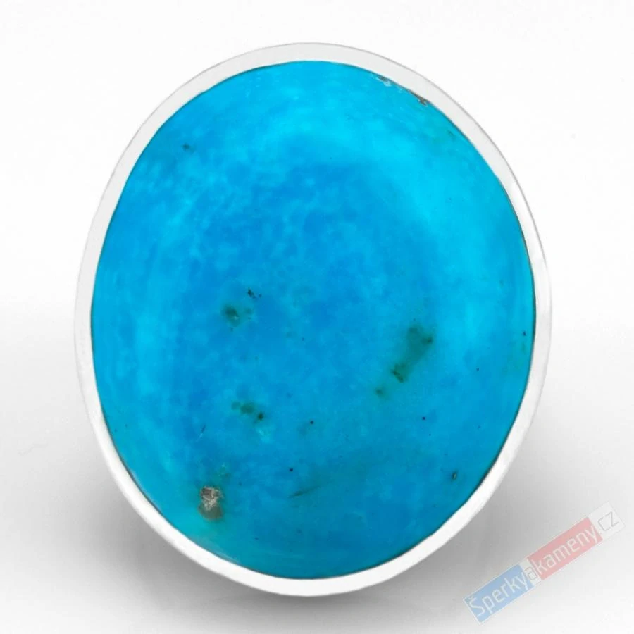 Velký stříbrný prsten (Ag 925/1000) s pravým tyrkysem z Arizony vysoké kvality QA (RARITA). Kámen má tvar oválu o výšce cca 28 mm, šířce cca 24 mm a tloušťce/hloubce cca 10 mm. Váha prstenu 14,0 g. Nastavitelná velikost od cca 54 do cca 58. Prsten je identický s fotografií. Původ minerálu: Arizona (USA).